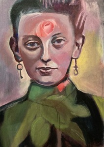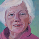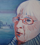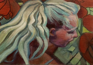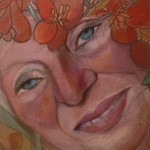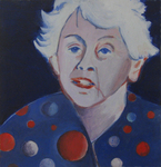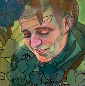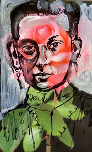2021Mijn oma is gestorven voordat ik werd geboren. Toen ik in verwachting was van mijn zoon droomde ik dat ik met haar de eierdans danste, als teken van vruchtbaarheid Zij hield van tuinieren, van mijn tante Aat kreeg ik een rozenstek uit oma's tuin afkomstig. De roos bloeide weelderig, de rozenblaadjes rangschikte ik rond haar gezicht op een fotoportret Vervolgens maakte ik daar weer een foto van die mij inspireerde tot dit geschilderd portret Geschilderd op linnen Ploeggordijnstof met bloemenprint