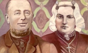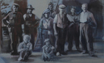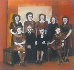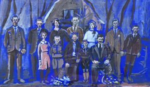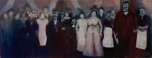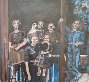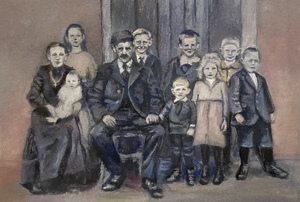 2018Bij een neef van mijn vader, Siem Broersen [Pieterszoon} vond ik een prachtige foto met dit familiegezelschap waarop ik mijn overgrootmoeder Catharina Broersen-Schilder ontdekte. Waarschijnlijk staat mijn overgrootvader Jan Broersen er ook op, of maakte hij de foto? Het zou kunnen zijn dat de vrouw rechts, enigszins op de voorgrond tredend, dezelfde is als het uitvergrote portret wat ik maakte, zie onbekend familielid II Dit was het laatste stukje gordijnstof waarop juist dit gezelschap pastte. Tijdens het schilderproces onstond er de suggestie dat het gezelschap uit het verleden door een poort tevoorschijnkomen. Sommige gezichten komen niet te voorschijn, zoals mensen in de vergetelheid geraken