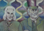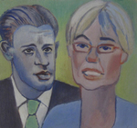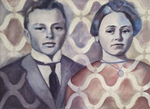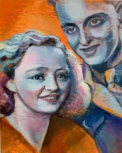 2021Schoonouders van mijn zus Carolien. De foto waarop ik het schilderij baseerde vond ik het boek Fietsen op zee, naar Santiago en toen verder, geschreven door Marten Horjus, Carolien's zwager. Tijdens het schilderen luisterde ik veel naar oude jazz muziek. Het nummer Night in Tunesia wilde ik keer op keer horen en vond het heel goed passen in de sfeer van het doek. Nu bleek dat Baukje Horjus-Abma een fan was van Ella Fitzgerald, dat maakt het verhaal compleet! De drager van het doek heeft een ingeweven bloempatroon