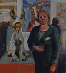 2018Zelfportet in atelier. Tijdens het maken van een zelfportet zag ik mijn voorouders, reeds eerder geschilderd, weerspiegeld en besloot nog een zelfportret te maken met hen rondom mij heen. Daar ik een ronde spiegel met uitklapbare zijkanten gebruikte, kon ik ze allemaal zien vanaf mijn stoel, met de spiegel pal voor mij. Ik schilder zonder mijn bril (bijziend) zodoende heb ik mijzelf ook zonder bril afgebeeld. De voorouders zijn in spiegelbeeld geschilderd, zoals ze zichzelf hebben gezien en ik hen zag.