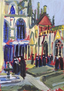 2022Mijn vader vertelde over vroeger: de paters liepen met hun witte gewaden wapperend door de Korte Belkmerweg en voelde zich heel voornaam. Zelf kan ik mij broeder Ab nog herinneren, hij sprak mij aan met 'Marja' en niet als 'Mar', zijn welluidende lach kan ik nog horen als een echo uit het verleden. Het waren missionarissen die naar Tanzania en Oeganda trokken en collecteerde bij de kerk in 't Zand voor de missie. Tante Dina was een zus van mijn oma het schilderij is opgezet met een zg. beperkt palet