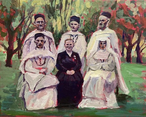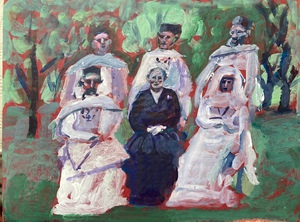 2022Dit is de eerste versie op karton van tante Dina, zus van mijn oma met haar zonen de witte paters Cor, Jacob, Ab, Piet en haar dochter Rika, witte zuster Het werk is snel opgezet in zg beperkt palet