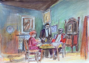 2020Scène uit 'Je kunt het toch niet meenemen' [door G.S. Kaufman en M.Hart vertaald door Arend Hauer] met Stijntje Lenting en Piet Broersen opgevoerd in 1967 door toneelvereniging E.M.M. tekening naar foto uit boek 100 jarig bestaan Toneelvereniging E.M.M.