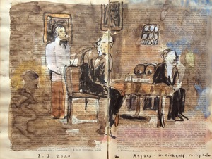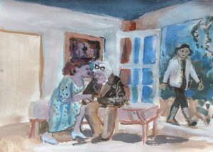 2020Scène uit toneelstuk Sjeik gesignaleerd met Tineke Kuiper, Gerard Sijs en Piet Broersen, opgevoerd in 1986 door toneelverening E.M.M. tekening naar foto uit boek 100 jarig bestaan toneelvereninging E.M.M. tempera op papier